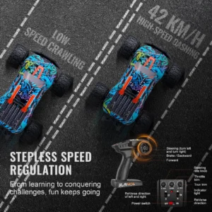 • Colorful Outfit: Eye-catching design and vibrant colors make this RC car stand out on any terrain.
