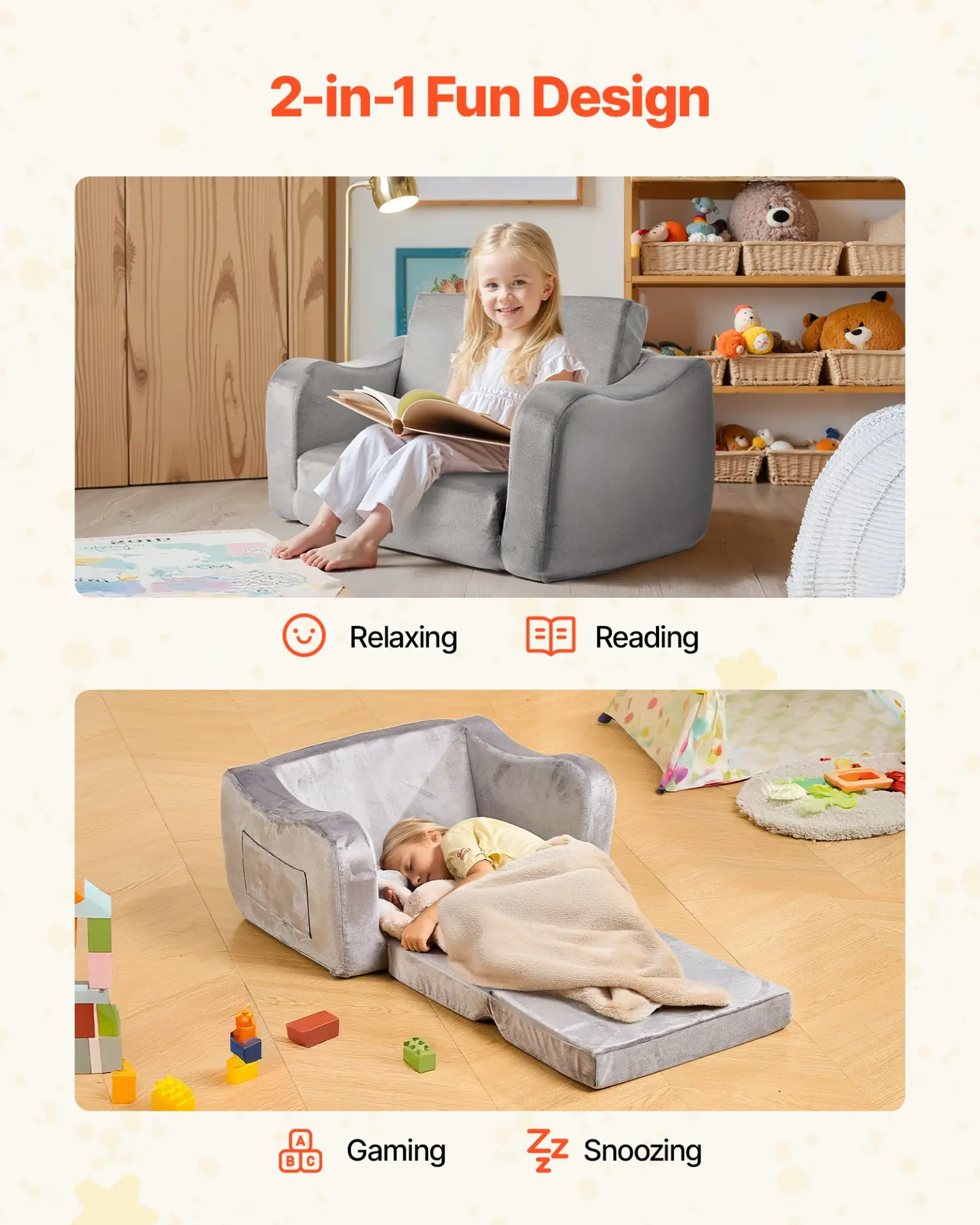 Transform Your Child’s Comfort: The 2-in-1 Kids Sofa is the ultimate versatile piece of furniture for your child. Seamlessly switch from a comfy chair to a relaxing lounger, making it perfect for playtime, storytime, or naptime.